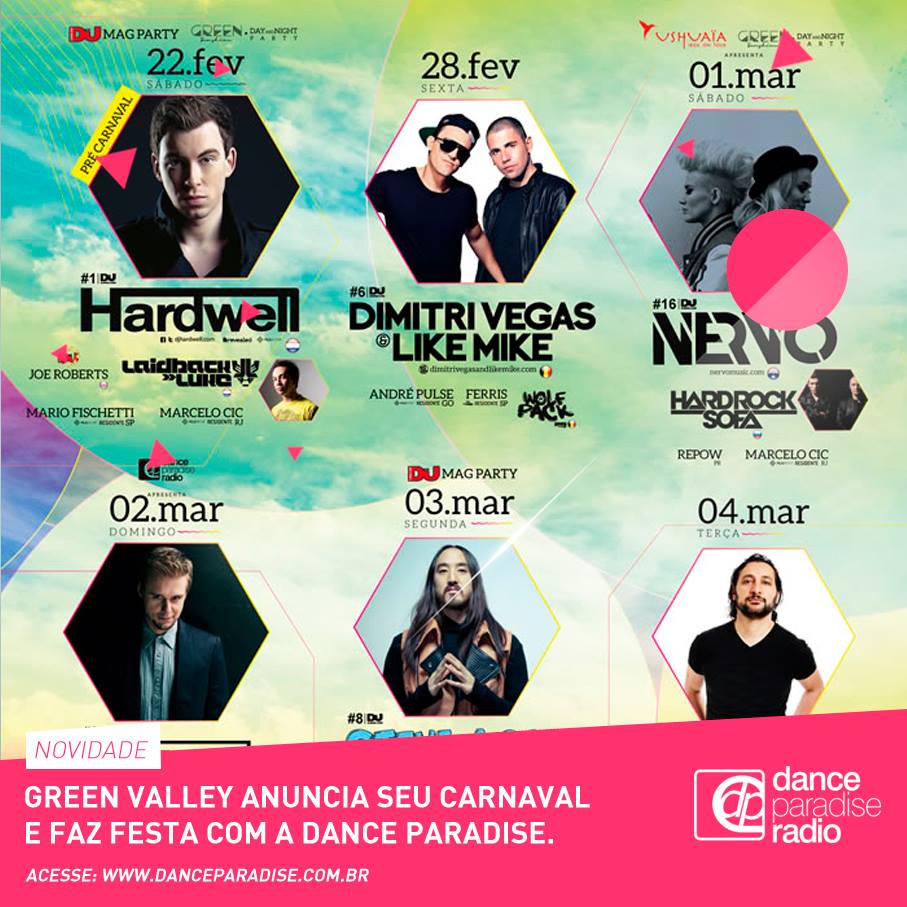 Mantendo a tradição de realizar há seis anos um dos maiores carnavais eletrônicos do país, o Green Valley trará para os dias de folia deste ano as maiores estrelas da atualidade da EDM. Serão cinco dias de festas durante o carnaval e um pré-Carnaval luxuoso dia 22 de fevereiro, com uma festa de assinatura toda particular: “O Melhor Dj do Mundo no Melhor Club do Mundo”, quando Hardwell vai ser a estrela.